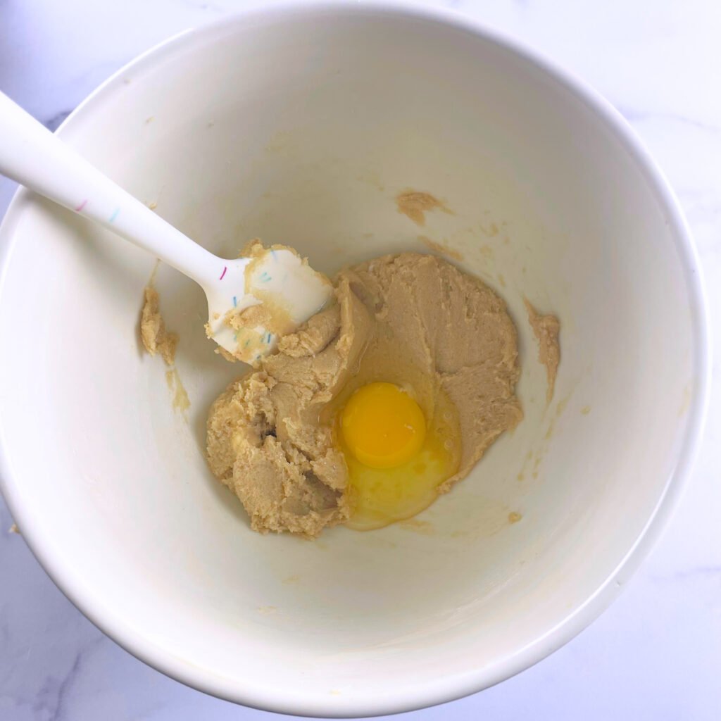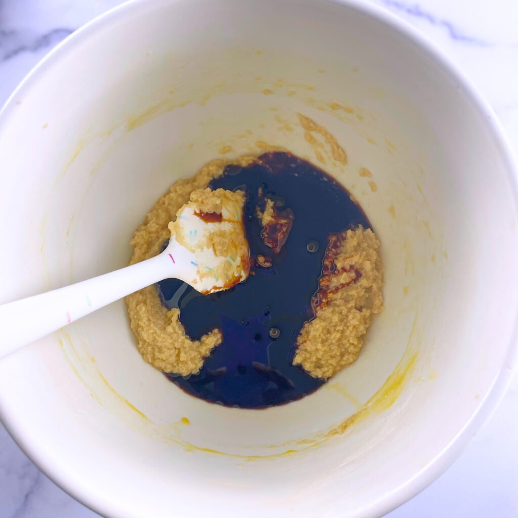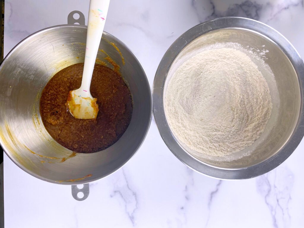 - In a large mixing bowl, add the brown sugar, eggs, vanilla extract, vegetable oil, and melted butter. Whisk until smooth and fully incorporated.