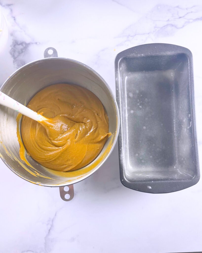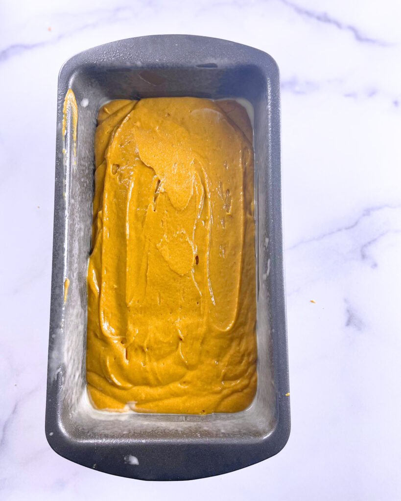 - Pour the batter into the prepared loaf pan and smooth the top.