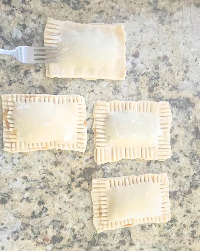• Use a fork to crimp the edges firmly, sealing in the pumpkin filling and creating the classic pop-tart look.
