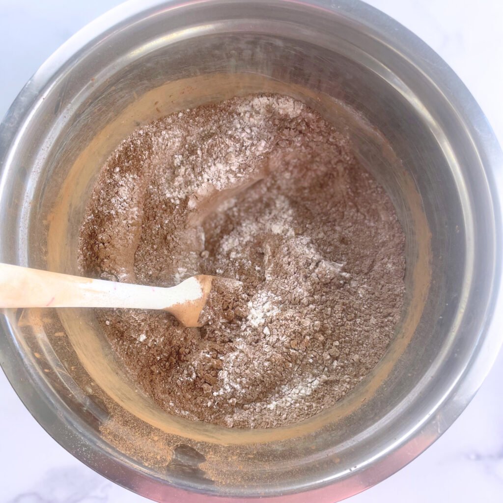 Whisk thoroughly to evenly distribute the leavening agents and cocoa.