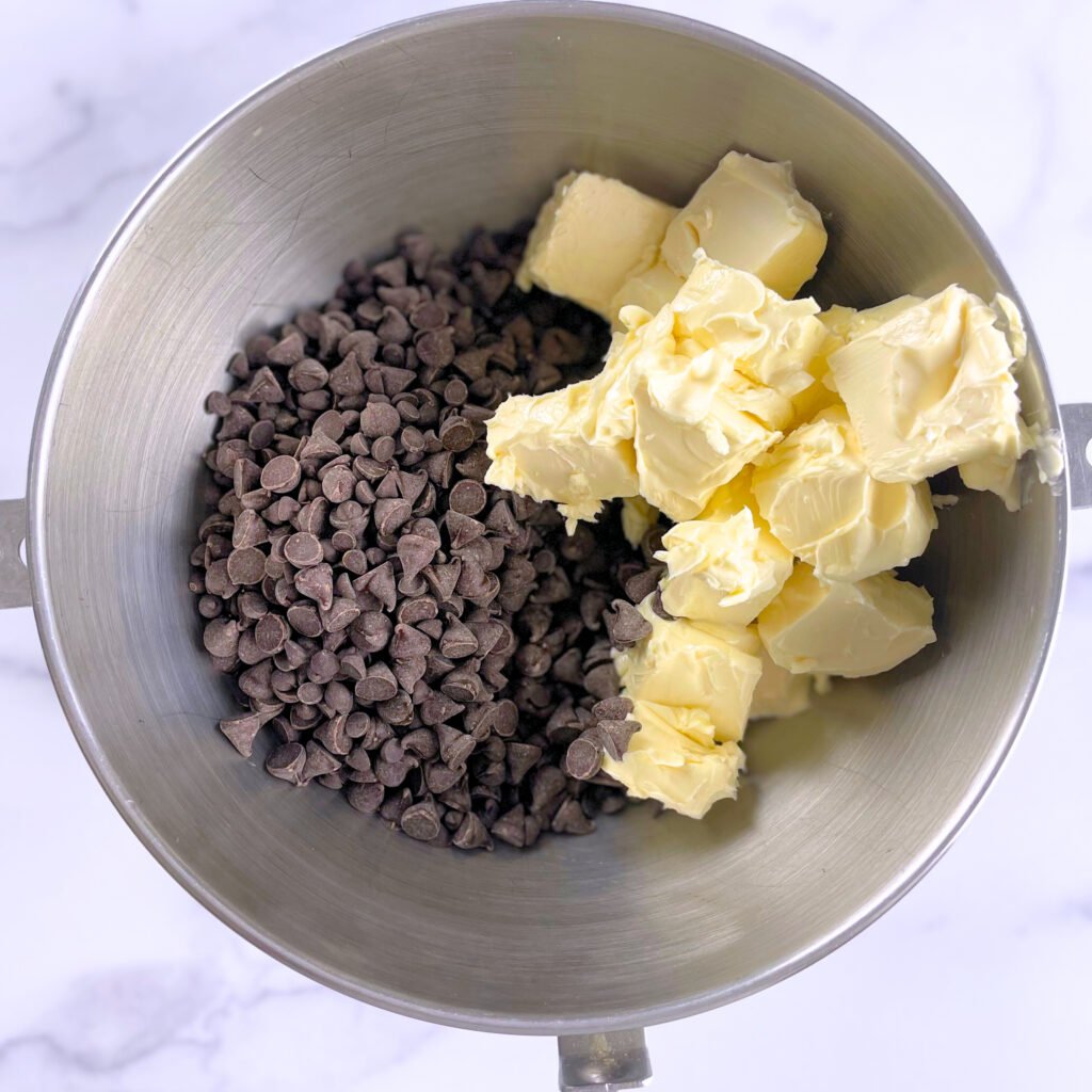 - For the chocolate buttercream, place vegan butter and chocolate in a double boiler over medium-low heat.