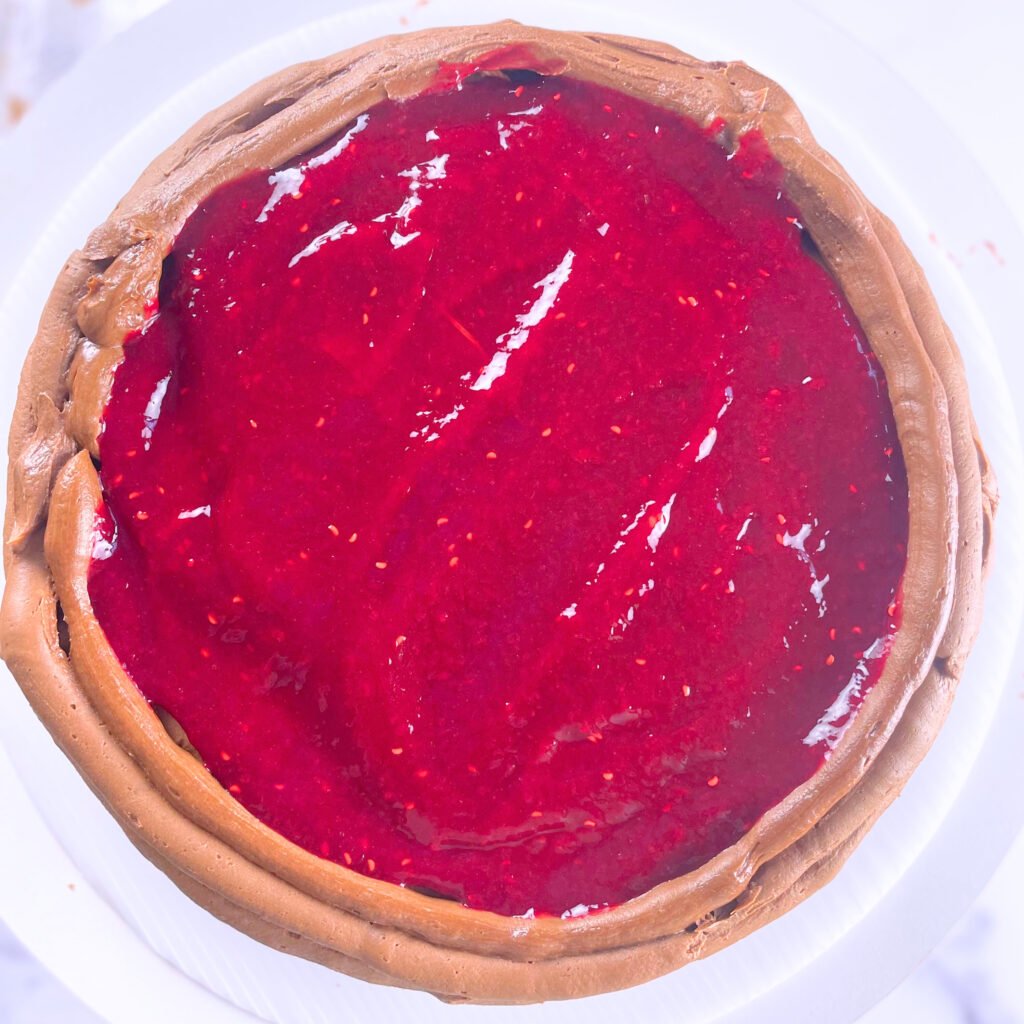 Start by placing one vegan chocolate cake layer on a serving plate or cake stand. Using an offset spatula, spread an even layer of homemade vegan raspberry filling over the top, leaving about a ½-inch border around the edges. This border helps prevent the filling from spilling out once the second layer is added. The raspberry filling should be fully cooled and thickened, which allows it to hold its shape and create a defined layer between the cakes.